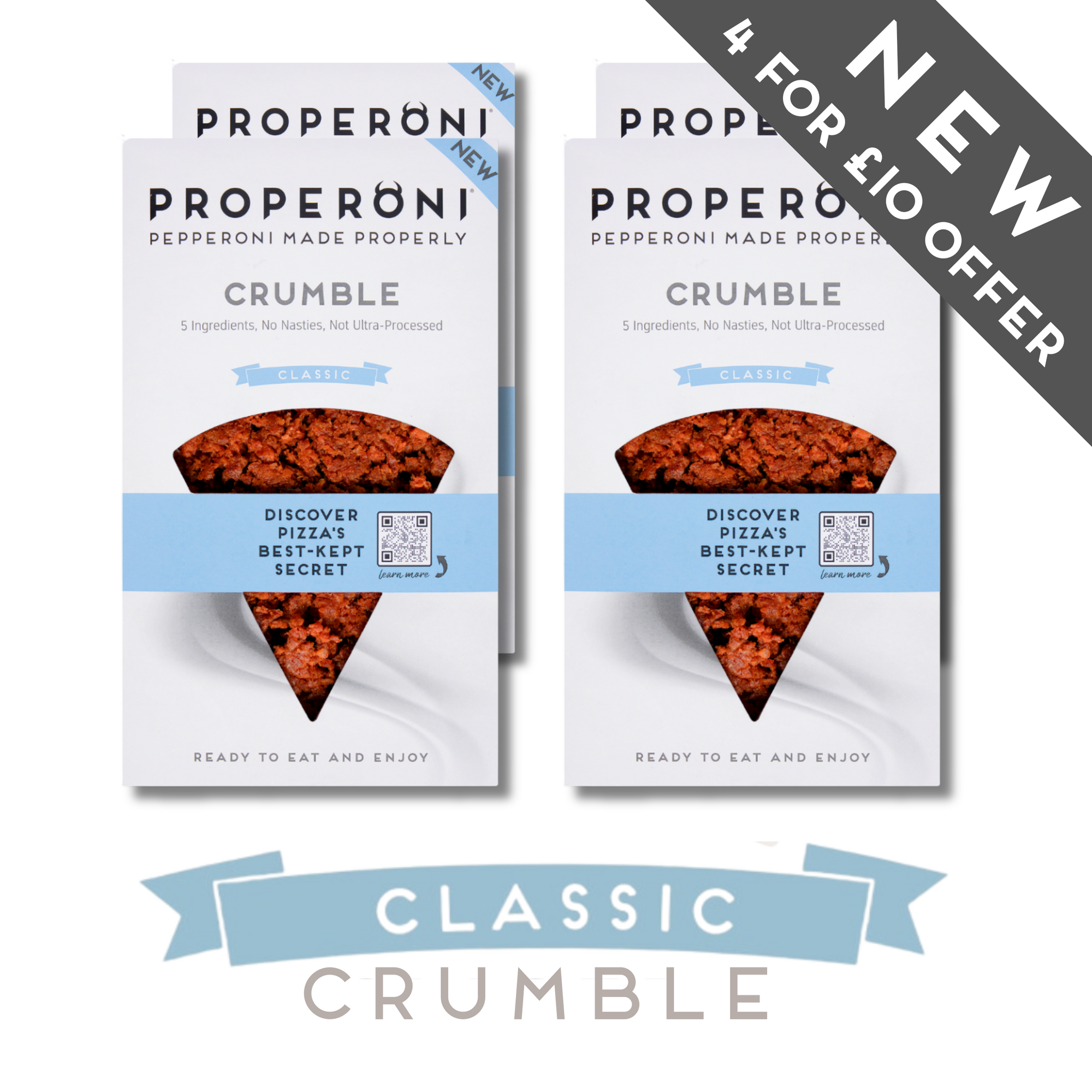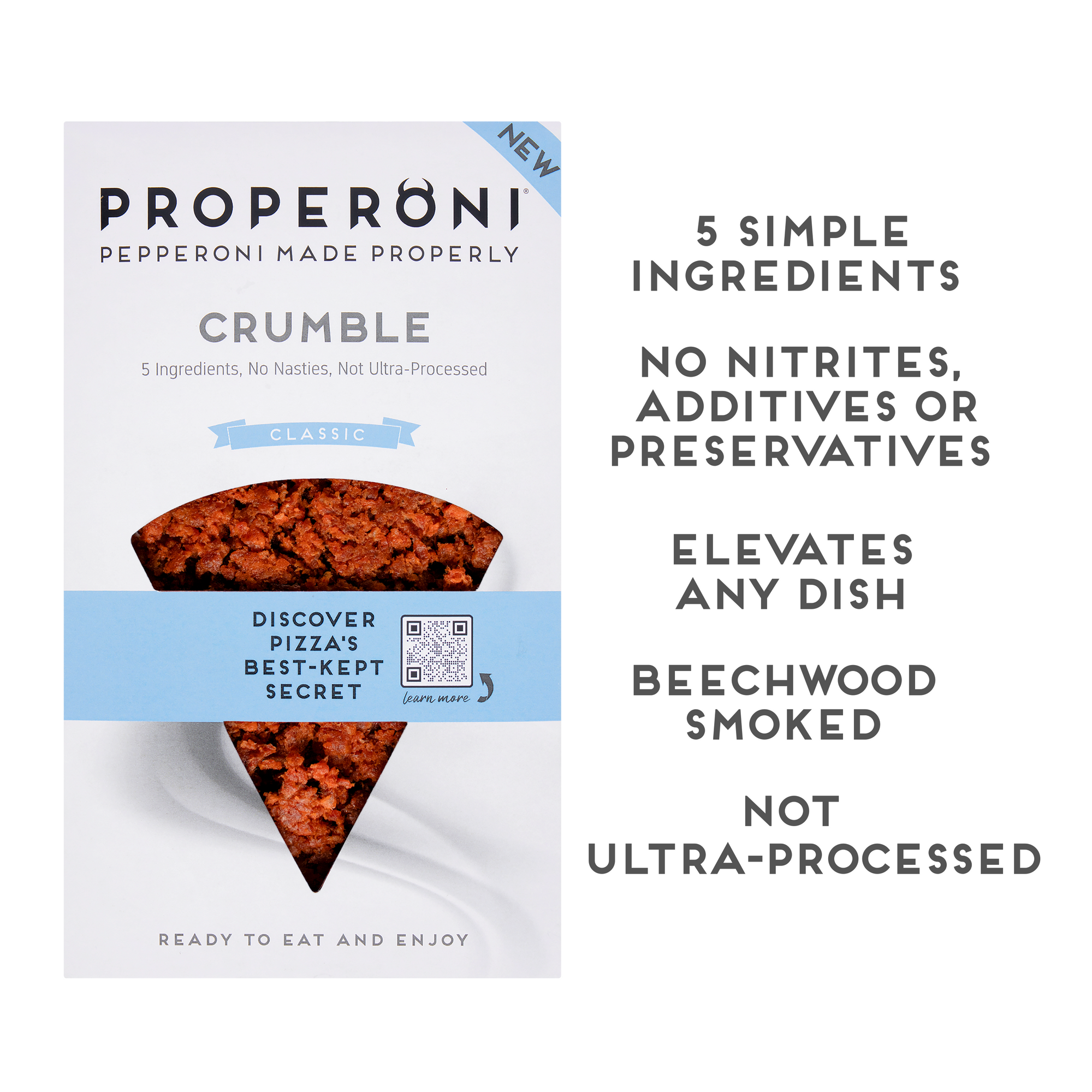 Did you know PROPERONI® crumble already features on the menus of top pizza restaurants across the UK? Created with the pizza lover in mind, this versatile dry cured pepperoni sausage crumble allows you to make innovative pizza creations at home. PROPERONI® believe in doing things properly. That means just a handful of recognisable ingredients, time-honoured production methods and zero shortcuts. No nitrites, no additives, no preservatives, no ultra-processing, no compromises. Proudly made in Gyula, Hungary, this crumble is slowly smoked over beechwood logs and naturally cured to create a rich, smoky flavour that sets it apart, using techniques perfected for over 150 years. Whether you simply sprinkle on top of a pizza, double load with a sliced pepperoni, stir into pasta dishes, or use as a tasty topping for salads, this crumble will elevate any dish!
